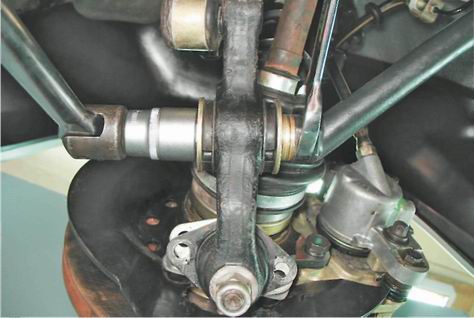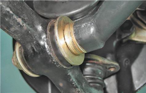 7. Чтобы при установке рычага минимизировать нарушение регулировки угла продольного наклона оси поворота, подсчитайте и запишите количество регулировочных шайб находящихся на заднем конце продольной растяжки.