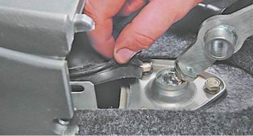 3. Удерживая ключом на 13 мм болт крепления тяги к рычагу от проворачивания, вторым ключом того же размера отворачиваем гайку.