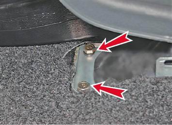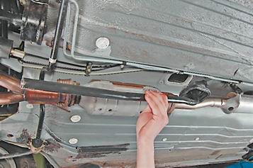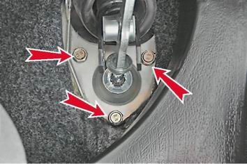 7. Для удобства снятия тяги снимаем облицовку туннеля пола (см. "Накладка туннеля пола - снятие и установка"). 8. Снизу автомобиля ключом на 10 мм отворачиваем четыре гайки крепления и снимаем экран.