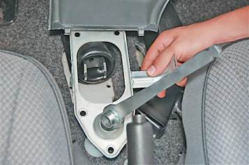 19. Для снятия рычага снимаем правую накладку консоли панели приборов (см. "Панель приборов - снятие и установка"). 20. Ключом на 13 мм выворачиваем два болта заднего крепления кронштейна рычага...