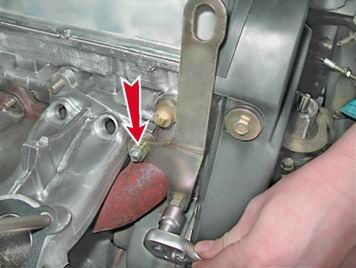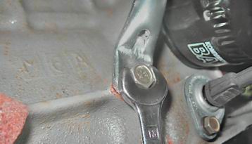 4. Ключом на 13 мм отворачиваем болт нижнего крепления правой штанги к блоку цилиндров.