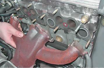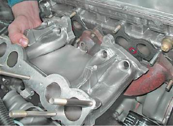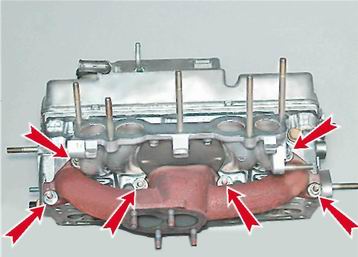 14. Ключом на 13 мм с удлинителем отворачиваем четыре гайки верхнего крепления и две гайки нижнего крепления впускного трубопровода и выпускного коллектора (для наглядности показано на снятой головке блока цилиндров).