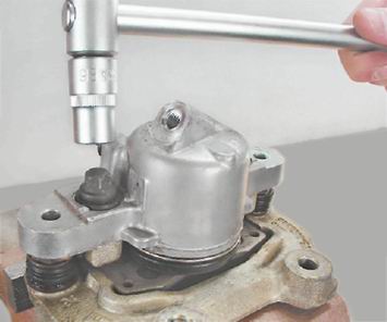 Рабочий цилиндр переднего тормозного механизма - снятие и установкаДля выполнения работы потребуется торцовый ключ Torx T-16. Снятие 1. Снимаем суппорт (см. "Суппорт переднего тормозного механизма - снятие и установка"). 2. Закрепляем суппорт в тисках и отворачиваем болты направляющих пальцев (см. "Передние тормозные колодки - замена"). 3. Торцовым ключом Torx Т-16 выворачиваем два болта крепления корпуса цилиндра к подвижной скобе.