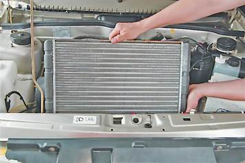 Установка Совет: Если радиатор был в эксплуатации, то перед установкой очистите его снаружи от пуха и другого мусора. Промойте его внутреннюю полость с моющим средством для системы охлаждения (см. "Эксплуатационные и ремонтные материалы"), а снаружи - струей воды. 1. При замене радиатора переставляем на новый радиатор резиновые опоры и пробку сливного отверстия с прокладкой (если на новом радиаторе они отсутствуют). 2. Устанавливаем радиатор на место в последовательности, обратной снятию. 3. Устанавливаем электровентилятор и соединяем колодку жгута проводов. 4. Заполняем систему охлаждения двигателя жидкостью (см. "Охлаждающая жидкость - замена"). 5. Убеждаемся в отсутствии подтекания охлаждающей жидкости в местах соединений. При необходимости подтягиваем хомуты крепления шлангов. |
