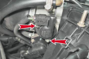 Замечание: Напряжение должно быть не меньше 12 В. Если напряжение не поступает на колодку или оно меньше 12 В, то разряжена аккумуляторная батарея, неисправна цепь питания или неисправен ЭБУ. Предупреждение! По окончании измерения напряжения выключайте зажигание. Снятие Замечание: На двигателе 11183 (1,6i) отворачиваем две гайки крепления дроссельного узла к ресиверу. Отводим дроссельный узел от торца ресивера на 10-15 мм (не снимая со шпилек) так, чтобы был открыт доступ к обоим винтам крепления регулятора холостого хода. 1. Крестовой отверткой отворачиваем два винта крепления регулятора холостого хода к корпусу дроссельной заслонки.