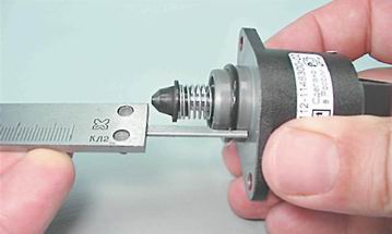 Замечание: Электрическое сопротивление между выводами А-В и C-D должно быть около 53 Ом. Сопротивление между выводами А-С и B-D должно быть большим (стремиться к бесконечности). Неисправный регулятор необходимо заменить. Установка Предупреждение! Перед установкой нового регулятора необходимо убедиться, что игла клапана выступает не более, чем на 23 мм. 1. Штангенциркулем-глубомером измеряем выступание иглы нового клапана.