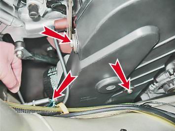 Ремень привода грм - проверка состояния и регулировка натяженияРемень привода газораспределительного механизма следует проверять при проведении ТО автомобиля - каждые 15000 км. Для выполнения работы потребуется ключ для натяжения ремня привода ГРМ. Последовательность выполнения 1. Подготавливаем автомобиль к выполнению работы (см. "Подготовка автомобиля к техническому обслуживанию и ремонту). 2. Ключом на 10 мм отворачиваем три болта крепления передней крышки ремня привода ГРМ.