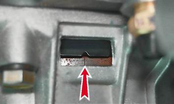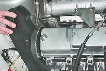 Если прилагаемого усилия не хватает, чтобы повернуть ремень на требуемый угол, то ремень перетянут; если ремень можно развернуть на больший угол - он натянут недостаточно. Предупреждение! Регулировать натяжение ремня следует на холодном двигателе. Чрезмерное натяжение ремня, попадание на него масла и грязи сокращает срок службы ремня, а также подшипников натяжного ролика и насоса охлаждающей жидкости. При слабом натяжении ремня возможно его перескакивание через несколько зубьев шкива распределительного вала. 6. Чтобы проверить взаимное положение распределительного и коленчатого валов, устанавливаем поршень первого цилиндра в ВМТ такта сжатия. Для этого: а. Снимаем резиновую заглушку, установленную в верхней части картера сцепления.