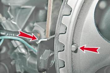 ...до совмещения метки на шкиве распределительного вала и выступа задней крышки ремня привода ГРМ.