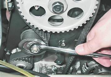 Рекомендации: Если взаимное положение коленчатого и распределительного валов нарушено, то поверните коленчатый вал до совмещения метки с центром шкалы. Ослабьте натяжение ремня и снимите его со шкива распределительного вала. Поверните распределительный вал до совпадения метки на его шкиве с выступом на задней крышке. Не меняя взаимного положения валов, наденьте ремень на шкив распределительного вала и отрегулируйте натяжение ремня. 7. Ключом на 17 мм отпускаем затяжку гайки крепления натяжного ролика.