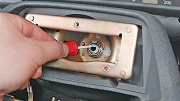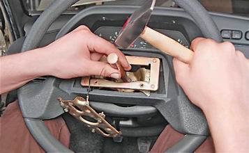 8. Чтобы ослабить крепление рулевого колеса на шлицах вала рулевого управления, наносим несколько ударов молотком по торцу вала через выколотку из мягкого металла, одновременно подпирая рулевое колесо коленями на себя.