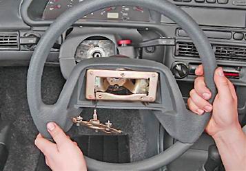 Рулевое колесо - снятие и установкаСнятие 1. Подготавливаем автомобиль к выполнению работы (см. "Подготовка автомобиля к техническому обслуживанию и ремонту"), снимаем клемму с отрицательного вывода аккумуляторной батареи. 2. Устанавливаем передние колеса автомобиля в положение прямолинейного движения. 3. Тонкой шлицевой отверткой поддеваем и снимаем декоративную вставку накладки рулевого колеса.