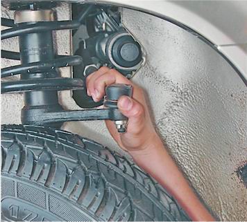 4. Для проверки отсутствия люфта в наконечниках рулевых тяг, помощник слегка покачивает рулевое колесо из стороны в сторону. Положив руку на место соединения рулевой тяги с поворотным рычагом стойки подвески так, чтобы ладонь касалась их одновременно. При появлении люфта в наконечнике рулевой тяги, будет ощущаться смещение поворотного рычага относительно тяги.