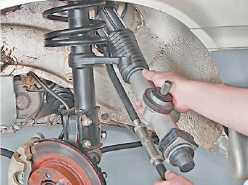 Рулевой механизм - снятие и установкаДля выполнения работы потребуется помощник. Снятие 1. Отсоединяем наконечников рулевых тяг от рычагов стоек передней подвески (см. "Наконечники рулевых тяг - замена). 2. Отворачиваем и вынимаем стяжной болт нижнего фланца эластичной муфты рулевого вала, и большой шлицевой отверткой разжимаем фланец (см. "Рулевая колонка - снятие и установка"). 3. Накидным ключом или торцовым ключом с глубокой головкой на 13 мм отворачиваем две гайки скобы правого крепления рулевого механизма к перегородке моторного отсека.