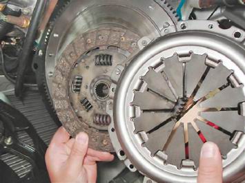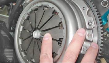 5. Устанавливаем на оправку ведомый диск сцепления, ориентируя его так, чтобы та сторона, где ступица диска выступает больше, была обращена к коробке передач.