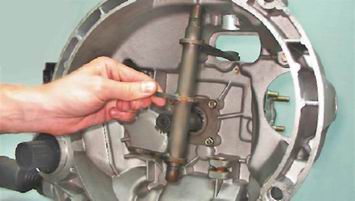 9. Сместив вверх, выводим из посадочного места нижний конец оси рычага вилки и снимаем вилку выключения сцепления.