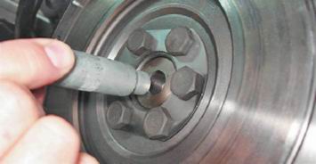 2. Торцовым или накидным ключом на 8 мм отворачиваем шесть болтов крепления корзины к маховику, удерживая маховик от проворачивания монтажной лопаткой или большой шлицевой отверткой.