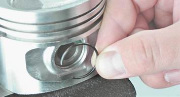 Шатунно-поршневая группа с плавающим пальцемДля выполнения работы потребуются: - нутромер; - пруток из мягкого металла (0,21 мм) или специальная оправка. Разборка 1. Снимаем с поршня поршневые кольца (см. "Поршневые кольца и шатунные вкладыши - замена"). 2. Шилом поддеваем и вынимаем из проточек стопорные кольца поршневого пальца.