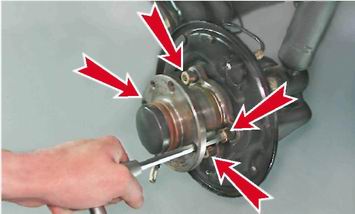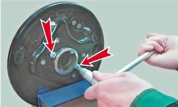 Щит заднего тормозного механизма - снятие и установкаДля выполнения работы потребуются: - шестигранный ключ на 8 мм с удлинителем; - мягкие накладки на губки тисков. Снятие 1. Снимаем со щита тормозные колодки (см. "Задние тормозные колодки - снятие и установка") и тормозной цилиндр (см. выше, "Рабочий цилиндр заднего тормозного механизма - замена"). 2. Через отверстие во фланце ступицы шестигранным ключом на 8 мм выворачиваем четыре болта крепления ее оси.