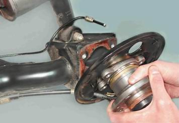 3. Пропуская трос стояночного тормоза через отверстие в опорном щите, снимаем ось в сборе со ступицей и щитом.