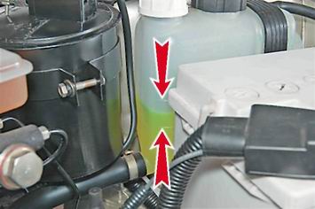 Система охлаждения - проверка технического состоянияПри эксплуатации автомобиля оценивать состояние системы охлаждения можно по указателю температуры охлаждающей жидкости и уровню жидкости в расширительном бачке. Понижение уровня охлаждающей жидкости, как правило, вызвано нарушением герметичности системы. На часть автомобилей установлен датчик уровня охлаждающей жидкости. При понижении уровня до отметки "MIN" загорается соответствующая контрольная лампа в блоке индикации бортовой системы контроля. Последовательность выполнения 1. Подготавливаем автомобиль к выполнению работы (см. "Подготовка автомобиля к техническому обслуживанию и ремонту"). Предупреждение! Уровень охлаждающей жидкости следует проверять на холодном двигателе. Некоторое повышение или понижение уровня охлаждающей жидкости при нагреве и охлаждении двигателя неисправностью не является. Это связано с тепловым изменением объема жидкости. 2. Проверяем уровень охлаждающей жидкости в расширительном бачке, который должен находиться на 25-30 мм выше метки "MIN", выполненной на корпусе расширительного бачка. Если уровень жидкости находится на отметке "MIN" или ниже, доливаем в бачок охлаждающую жидкость (см. "Охлаждающая жидкость - замена").