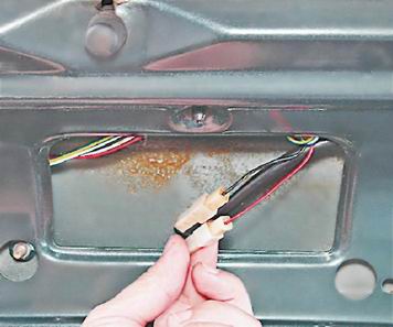 Спойлер - снятие и установкаСнятие 1. Подготавливаем автомобиль к выполнению работы (см. "Подготовка автомобиля к техническому обслуживанию и ремонту"). 2. Снимаем обивку двери багажного отделения (см. ниже, "Обивка двери багажного отделения - снятие и установка"). 3. Разъединяем колодки проводов фонаря дополнительного сигнала торможения.