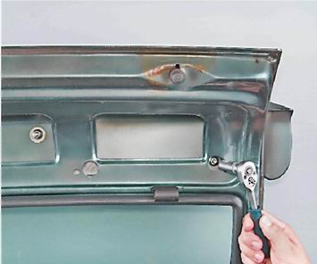 Замечание: На автомобилях ранних выпусков необходимо отвернуть гайку крепления наконечника "массового" провода фонаря дополнительного сигнала торможения к шпильке крепления замка двери багажного отделения. 4. Торцовым ключом на 10 мм отворачиваем две гайки крепления спойлера с правой стороны автомобиля.