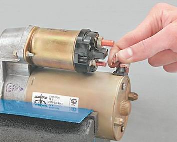 Стартер 5712.3708 и его модификацииРазборка 1. Торцовым ключом на 10 мм отворачиваем гайку крепления наконечника провода к выводу (контактному болту) тягового реле.