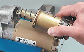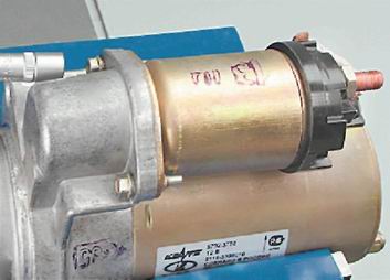 7. Вставляем в статор якорь стартера с надетыми на него щеточным узлом и задней крышкой (при этом необходимо придерживать якорь, чтобы его коллектор не вышел из зацепления со щеточным узлом). Дальнейшую сборку стартера выполняем в последовательности, обратной разборке. При этом на детали редуктора наносим смазку ШРУС-4. Перед установкой привода окунаем его в моторное масло и даем маслу стечь. Втулки, в которых вращаются валы якоря и привода, а также винтовые шлицы привода смазываем моторным маслом. 8. Чтобы убедится в правильности сборки стартера, перед установкой проверяем его работоспособность, как это показано в начале раздела. |