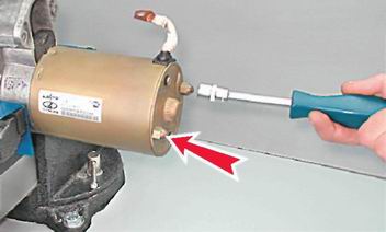 Рекомендация: Проверьте легкость хода сердечника тягового реле. Подсоедините к выводам тягового реле омметр и, утапливая якорь до упора, убедитесь, что замыкаются контактные болты (электрическое сопротивление близко к нулю). Неисправное тяговое реле необходимо заменить. 5. Торцовым ключом на 10 мм отворачиваем две гайки стяжных шпилек.