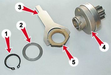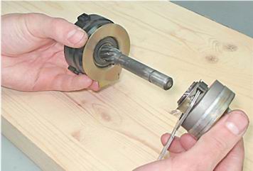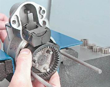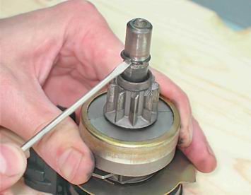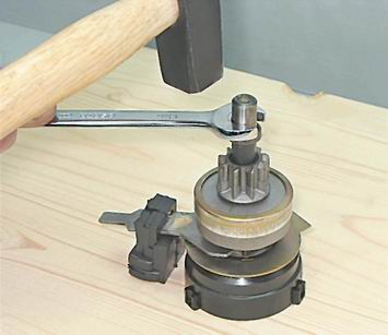 Рекомендация: Проверьте состояние привода. Привод должен свободно, без заедания, перемещаться по шлицам вала. Шестерня привода должна свободно проворачиваться только в одном направлении, недопустимы выкрашивание зубьев и сильные забоины на заходной части зубьев. Мелкие дефекты можно устранить алмазным надфилем или абразивным бруском. Необходимо заменить неисправный и сильно изношенный привод (либо стартер в сборе). 11. Молотком через рожковый ключ на 13 мм сбиваем кольцо ограничителя хода привода стартера (при этом под шестерню редуктора следует подложить деревянный брусок или кусок плотной резины).
