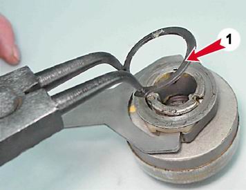14. Съемником снимаем стопорное кольцо (1) муфты рычага привода.