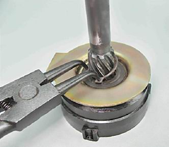 Замечание: При замене только привода, дальнейшие работы по разборке стартера можно не производить. 16. Съемником снимаем стопорное кольцо опоры вала привода.
