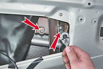 4. Торцовым ключом на 10 мм отворачиваем два болта крепления стекла к стеклоподъемнику.
