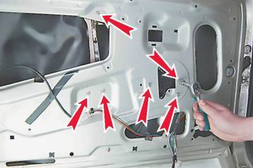 8. Торцовым ключом на 10 мм отворачиваем семь гаек крепления стеклоподъемника к усилителю двери.