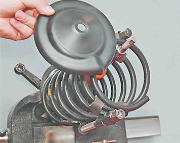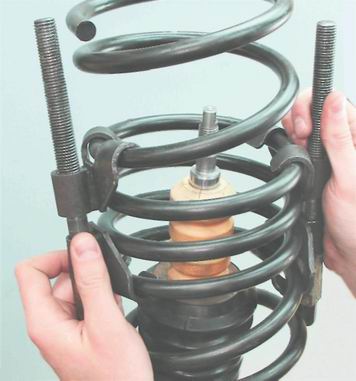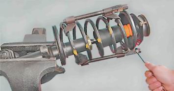 Стойка передней подвески - разборка и сборкаДля выполнения работы потребуются: - стяжки для пружин подвески; - приспособление для разборки стойки подвески. Разборка 1. Снимаем стойку с автомобиля (см. "Стойка передней подвески - снятие и установка"). 2. Зажимаем стойку в тисках. Внимание! Соблюдайте осторожность! Сжатая пружина обладает большой силой и при срыве стяжки, распрямляясь, может нанести травму. 3. Устанавливаем с противоположных сторон пружины стяжки и равномерно, без перекосов, стягиваем пружину до снятия нагрузки с верхней чашки пружины.