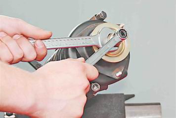 4. Устанавливаем приспособление для разборки стоек на гайку и шток амортизатора. Удерживая ключом на 17 мм шток амортизатора от проворачивания, ключом на 27 мм отворачиваем его гайку.
