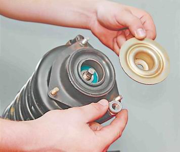 Сборка 1. Перед сборкой стойки, рукой полностью выдвигая и утапливая шток, убедитесь в исправности амортизатора. Если при перемещении штока чувствуются провалы, рывки или слышны посторонние звуки, замените амортизатор. 2. Проверьте целостность и исправность всех устанавливаемых на стойку элементов. Замените порванный или потрескавшийся защитный кожух штока амортизатора, поврежденный отбойник хода сжатия, треснувшую или прослабленную пружину подвески. 3. Пружины передней подвески по жесткости делятся на классы: "А" и "В". Класс пружины обозначается краской на наружной стороне одного из ее витков. Класс "А" - желтый цвет краски; класс "В" - зеленый (на автомобилях, поставляемых на экспорт, маркировка выполнена белым и голубым цветом соответственно). Предупреждение! В передней подвеске должны быть установлены пружины одного класса. |