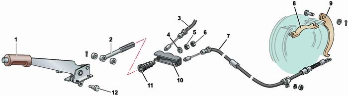 Стояночная тормозная система: 1 - рычаг привода стояночного тормоза; 2 - тяга рычага; 3 - трос привода тормозного механизма правого заднего колеса; 4 - шайба; 5 - регулировочная гайка; 6 - контргайка; 7 - трос привода тормозного механизма левого заднего колеса; 8 - распорная планка; 9 - рычаг; 10 - уравнитель тросов; 11 - резиновый чехол; 12 - ось тяги Рычаг привода стояночного тормоза двумя тросами связан с тормозными механизмами задних колес. При поднятии рычага в верхнее положение рычаги, установленные на задних колодках, поворачиваются и начинают давить на распорные планки. При этом колодки задних тормозных механизмов раздвигаются и фиксируют барабан от проворачивания. |