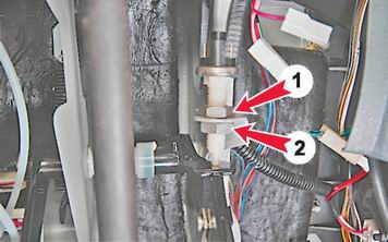 4. Рожковым ключом на 19 мм ослабляем затяжку одной из двух контргаек выключателя. Выключатель сигналов торможения одновременно является упором педали тормоза в ее верхнем положении. Чтобы уменьшить свободный ход - наворачиваем гайку (1) на выключатель и затягиваем гайку (2). Чтобы увеличить свободный ход - отворачиваем гайку (2) и затягиваем гайку (1).