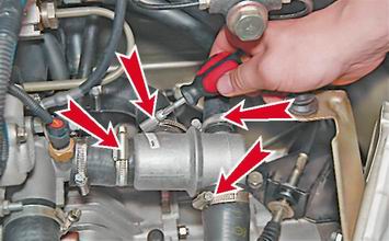 4. Отсоединяем шланги от патрубков термостата и снимаем термостат.