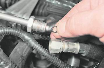 5. Отводим наконечник шланга от штуцера топливной рампы и, поддев шлицевой отверткой, снимаем резиновые уплотнительные кольца с концов трубок.