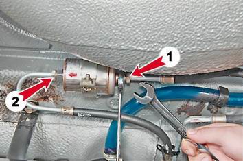 б) Удерживая фиксатор в нажатом положении, снимаем соединительный наконечник трубки топливопровода с выходного патрубка топливного фильтра. в) Аналогично снимаем соединительный наконечник трубки топливопровода с входного патрубка топливного фильтра. На автомобиле с двигателем 2111 (1,5i): а) Рожковым ключом на 19 мм удерживая фильтр от вращения за шестигранный патрубок, вторым рожковым ключом на 17 мм отворачиваем штуцер подводящего топливопровода (1). Аналогично отворачиваем штуцер отводящего топливопровода (2).