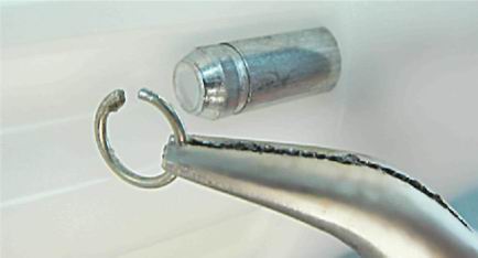 3. Плоскогубцами с тонкими губками снимаем стопорное кольцо с направляющей крышки топливного модуля.