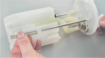 4. Выведя направляющие крышки из корпуса топливного модуля, снимаем пружину.