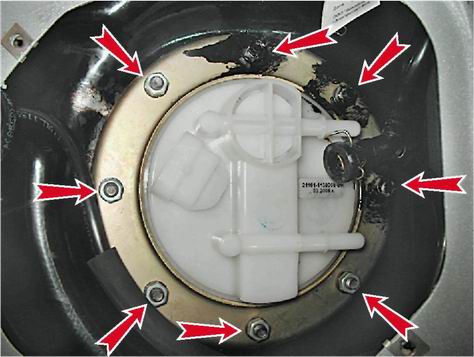 6. Торцовым ключом на 10 мм отворачиваем восемь гаек крепления прижимного кольца топливного модуля. Под гайками установлены пружинные шайбы.