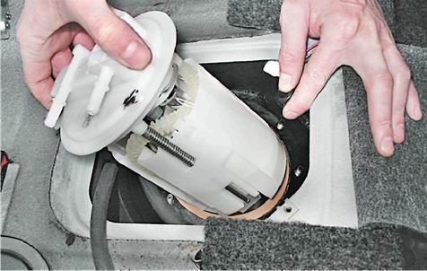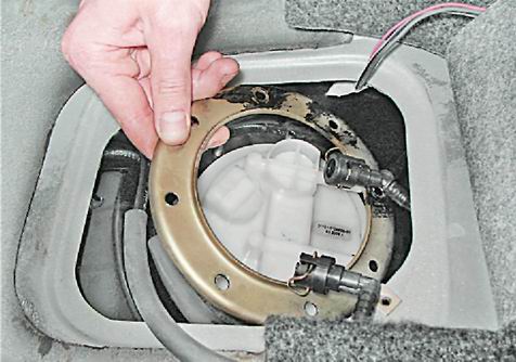 10. Выливаем бензин из заборной камеры топливного модуля в емкость объемом около 1 л. Установка Устанавливаем топливный модуль в обратной последовательности. Предупреждение! При установке модуля в бак убедитесь, что выступ на его крышке совпал с вырезом в дистанционном кольце.