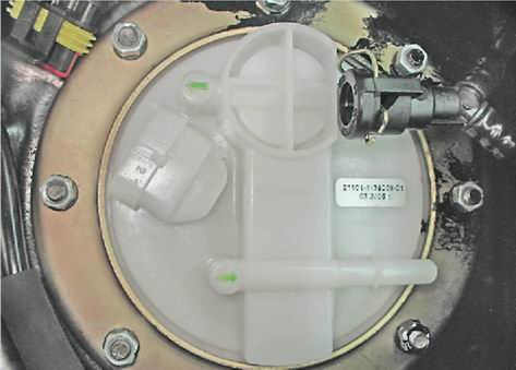 8. Под ним установлено дистанционное кольцо и резиновая уплотнительная прокладка. Поврежденную уплотнительную прокладку заменяем. 9. Вынимаем топливный модуль из бака. Предупреждение! Снимая топливный модуль, не погните рычаг датчика указателя уровня топлива. Для этого слегка наклоните модуль и аккуратно выведите поплавок из отверстия бака. Соединение топливного модуля с баком уплотнено резиновой прокладкой.
