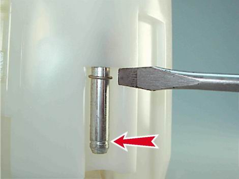 2. Крышка топливного модуля удерживается на двух направляющих. На одну из направляющих надета пружина. Пружина зафиксирована стопорным кольцом, установленным в верхнюю кольцевую проточку направляющей. Для снятия датчика указателя уровня топлива шлицевой отверткой с узким лезвием поддеваем и сдвигаем стопорное кольцо в нижнюю проточку направляющей.