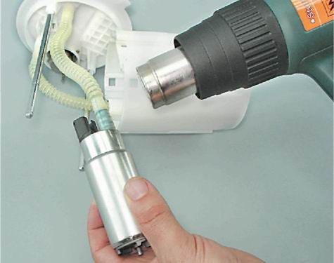 5. Феном (или облив кипятком) разогреваем конец гофрированной трубки, надетой на патрубок электробензонасоса.